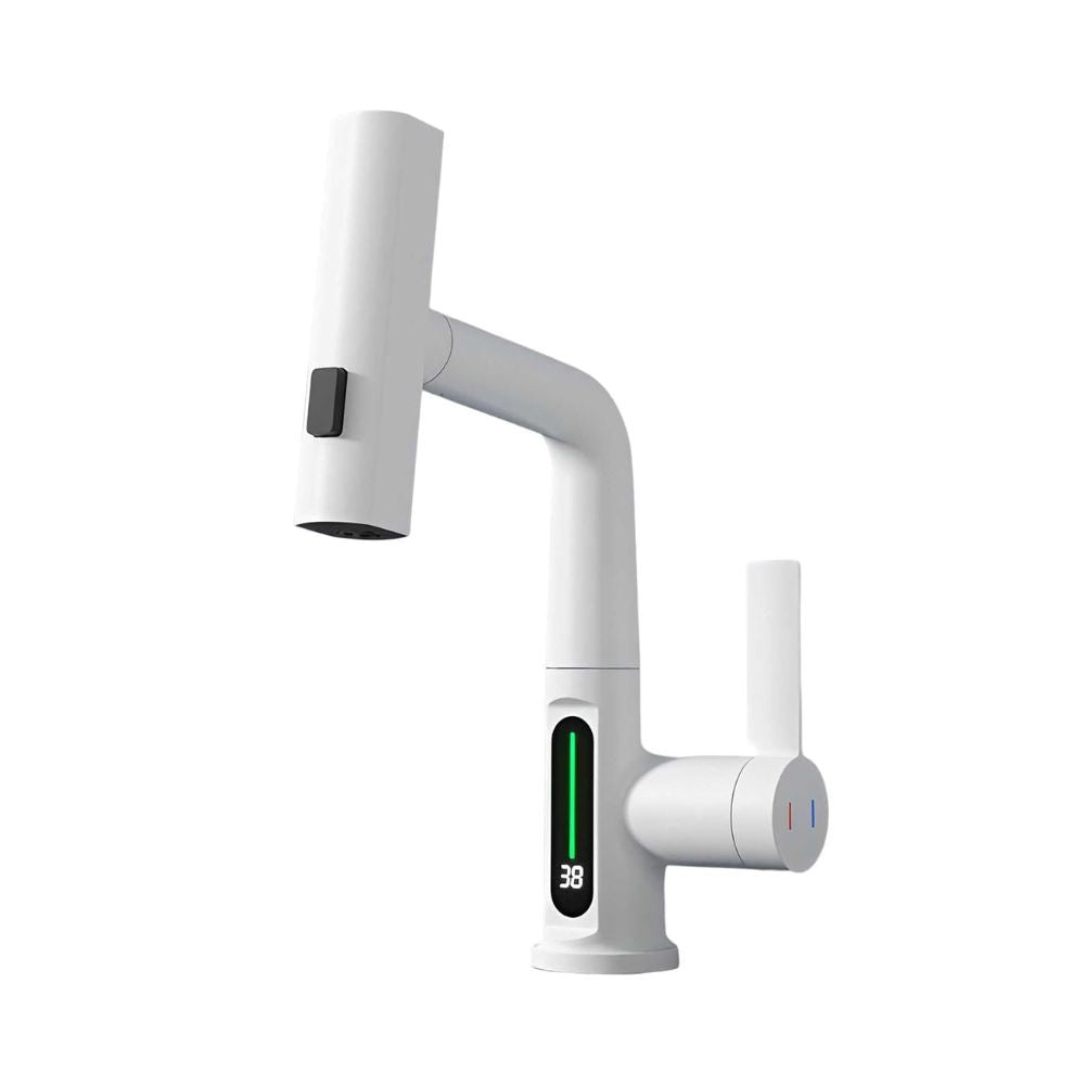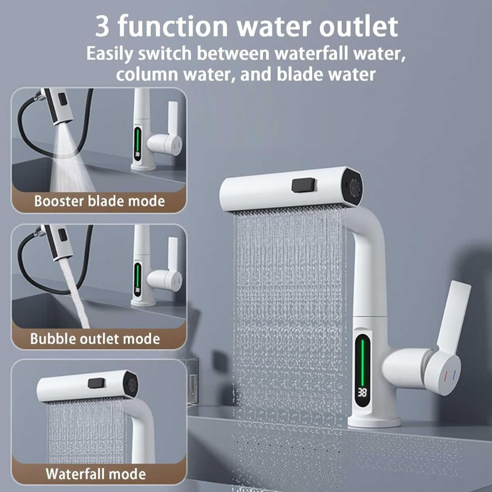 Versatile Application: This latest swivel waterfall faucet offers an intelligent experience. Available in matte black, white, chrome, or gray.