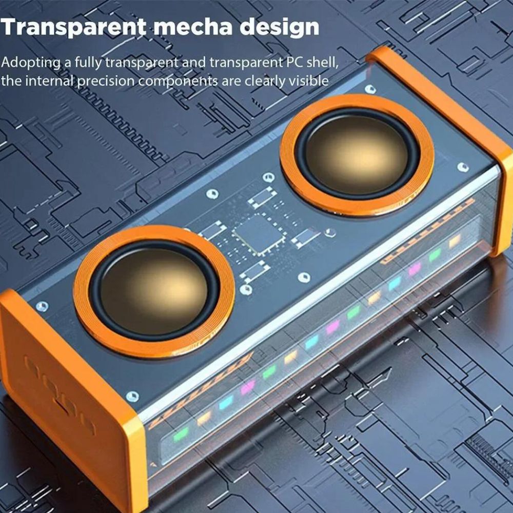 The transparent Mecha TWS Bluetooth Speaker offers 360° Panorama Sound effects and dynamic lights synchronized with the music, transforming your music into a visual and auditory experience.