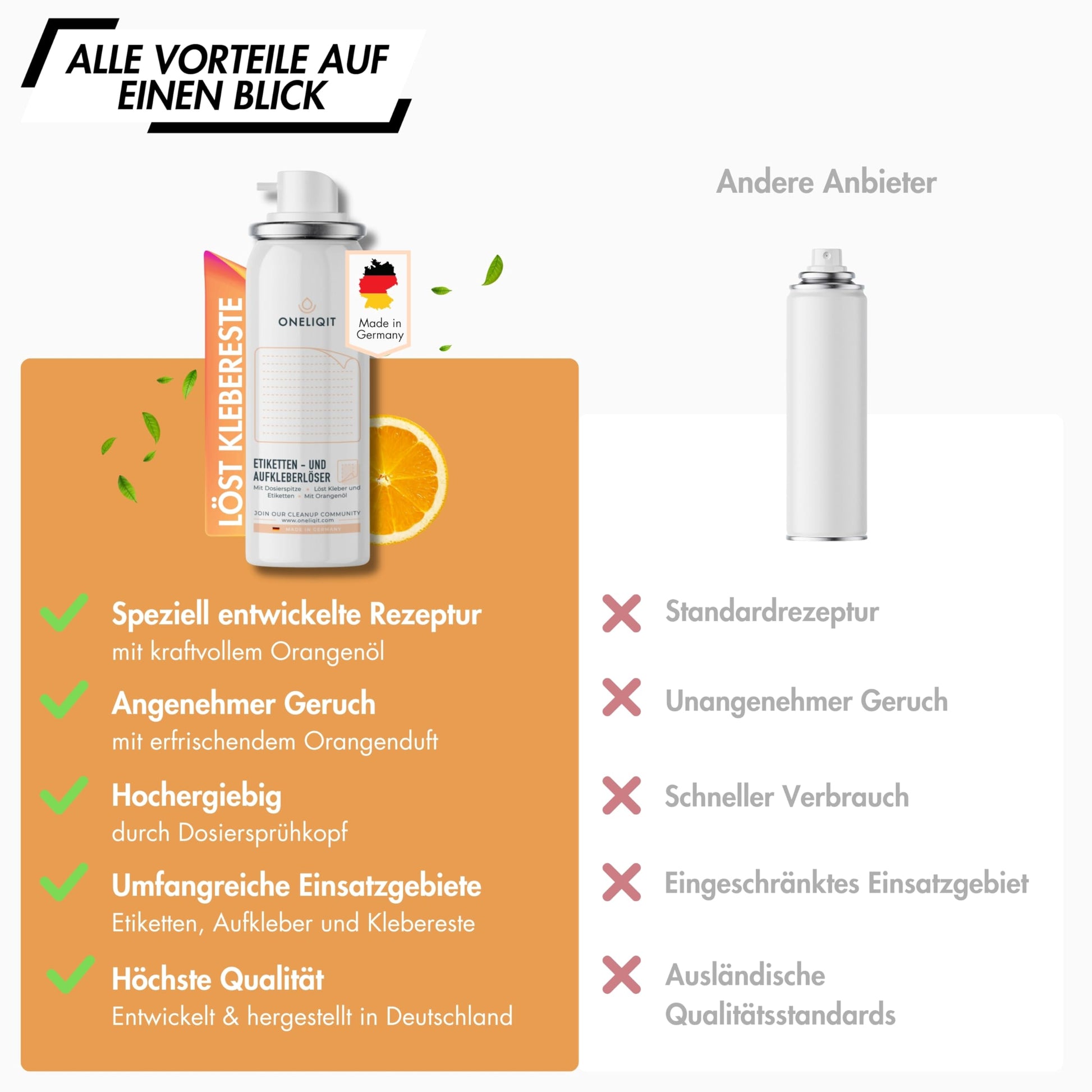 Reliably removes labels, adhesive residue, and stickers —even stubborn ones! With a fresh citrus scent , a rich formula , and a precise spray head . Suitable for many surfaces (test first). Made in Germany —developed by the founding team with a laboratory in the Lower Rhine region. In a practical value pack: More content, better price.