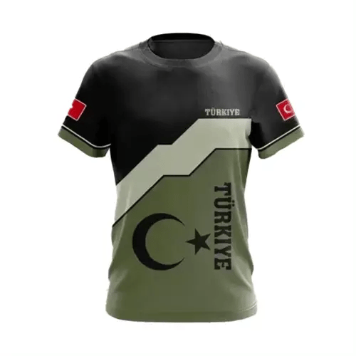 The first design showcases shades of green and black with the iconic crescent moon and star on the front and back. Rectangular Turkish flags in red and white adorn the sleeves, complemented by the striking inscription "TÜRKIYE".