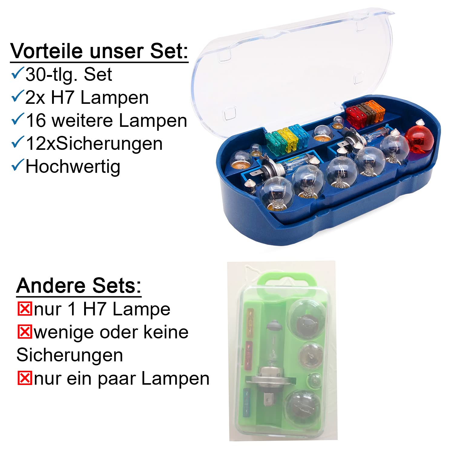 • Vollausstattung für Notfälle: Enthält H7, Standlicht, Brems-, Rück-, Blinker- und Innenraumlampen