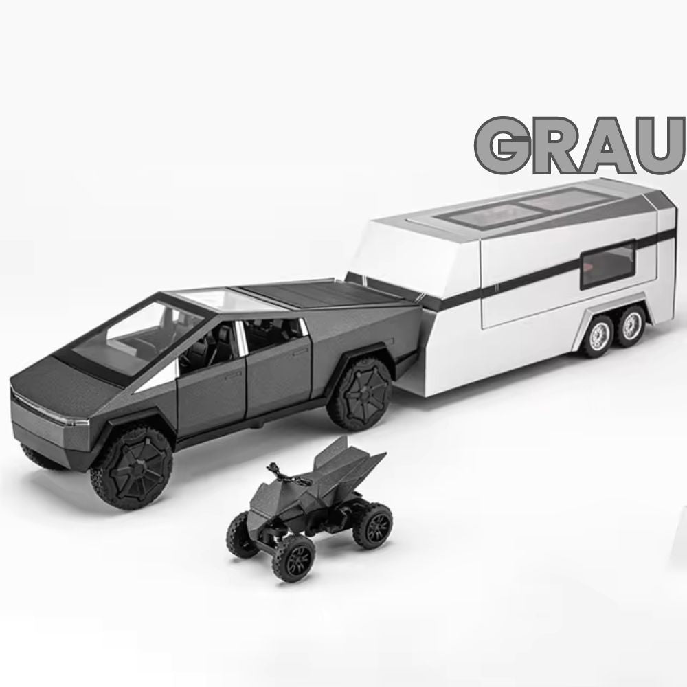 TESLA Cybertruck Modellauto (1:32) mit Trailer und Beach Motorrad | aus Druckgussmetall mit Licht und Sound